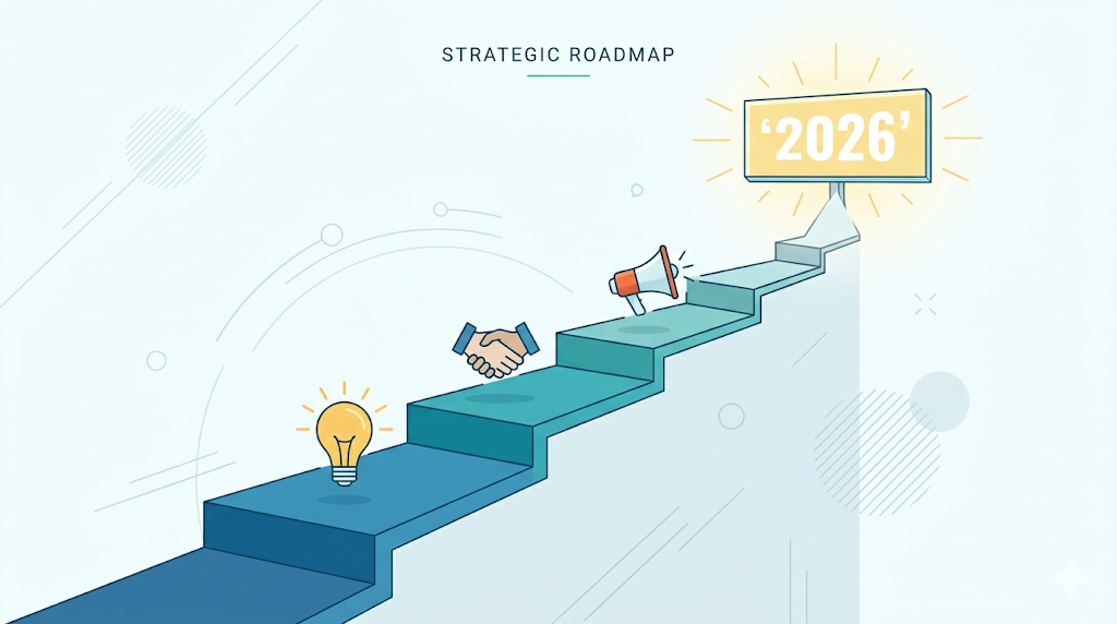Alt text: Clean illustration of a stepping-stone path leading to a glowing 2026 sign, with icons for education, collaboration, and marketing along the way.